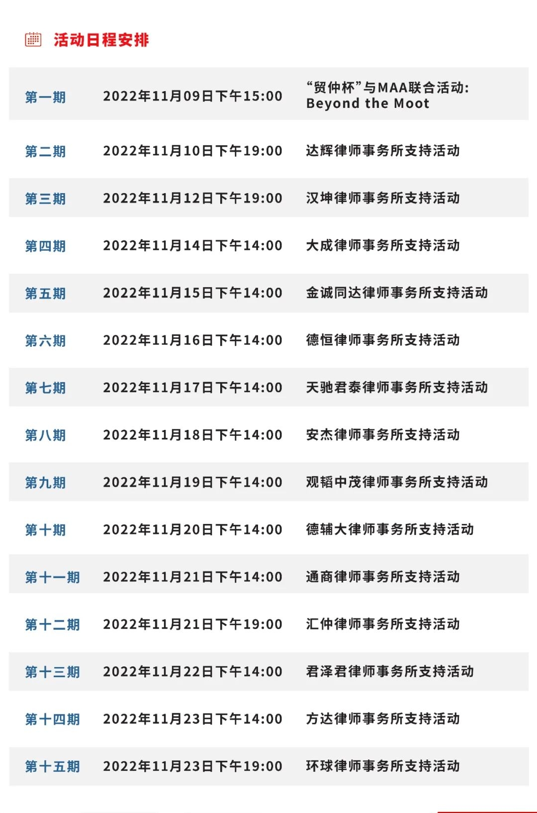 第二十屆“貿(mào)仲杯”國(guó)際商事仲裁模擬仲裁庭辯論賽Voice of Moot 系列培訓(xùn)活動(dòng)將于2022年11月9日開(kāi)始,至11月23日結(jié)束,共計(jì)15期相關(guān)活動(dòng)?!百Q(mào)仲杯”辯論賽自2000年舉辦至今已歷經(jīng)十九屆,辯論賽始終秉持培養(yǎng)具備國(guó)際化實(shí)務(wù)能力的涉外仲裁法治人才的初心,匯集了大批國(guó)際仲裁法律人才。