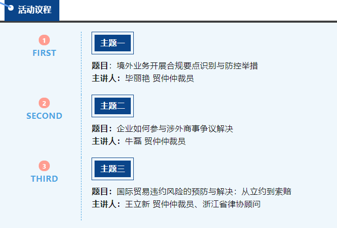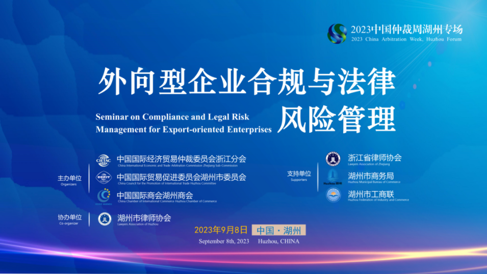 在全球化的商貿(mào)投資環(huán)境中,隨著我國經(jīng)濟主體“走出去”由量到質(zhì)的發(fā)展方向轉(zhuǎn)變,外向型企業(yè)面臨著日益復(fù)雜和多樣化的合規(guī)需求與法律風險,包括跨境貿(mào)易、投資、管制合規(guī)、知識產(chǎn)權(quán)合規(guī)、國際法與外國法合規(guī)、違約風險管理等。為幫助企業(yè)加強法律風險理解與識別、提高合規(guī)與法律風險管理能力,擬在浙江省湖州市舉辦“外向型企業(yè)合規(guī)與法律風險管理”研討會。