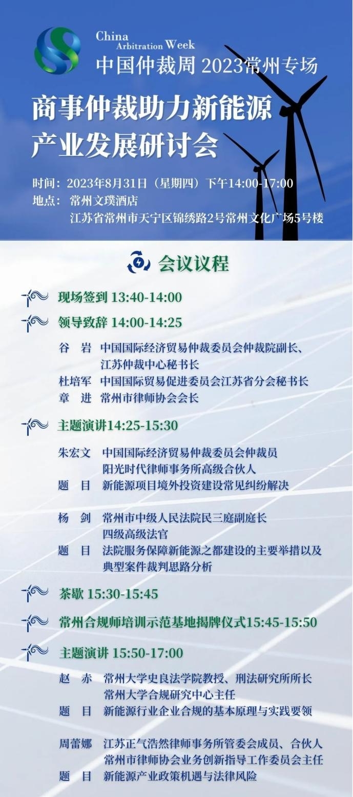 近年來,江蘇省常州市緊扣“國際化智造名城、長三角中軸樞紐”的城市定位,在新能源產業(yè)不斷發(fā)力,著力打造引領長三角,影響全國乃至全球的“新能源之都”。經濟的蓬勃發(fā)展,產業(yè)的日益興旺,離不開良好的營商環(huán)境和制度化、規(guī)范化的法律保護措施。本次“中國仲裁周”常州專場活動——商事仲裁助力新能源產業(yè)發(fā)展研討會,將聚焦新能源產業(yè)熱點問題,幫助企業(yè)進一步提升化解國內外商事爭議的能力,推動建設公平、高效、法治的市場環(huán)境。