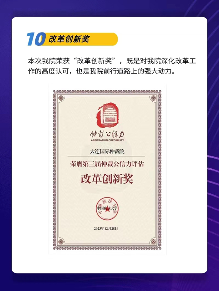 歷史的畫卷,在砥礪前行中鋪展;時代的華章,在接續(xù)奮斗中書寫。展望2024,大連國際仲裁院將在遼寧省大連市委、市政府的堅強領導下,始終秉持鑄造公信力的價值理念,以滾石上山、負重前行的決心抓發(fā)展,以“高質量、高效率、高服務水平”的三高標準為抓手,創(chuàng)新工作機制,著眼隊伍建設,拓寬服務領域,搭建服務平臺,努力營造優(yōu)質的仲裁法治環(huán)境,最大程度化解社會矛盾,實現(xiàn)大連仲裁事業(yè)的新跨越、新發(fā)展、新輝煌。