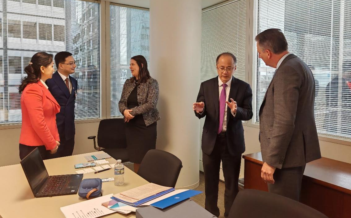 美國金融業(yè)監(jiān)管局爭議解決中心芝加哥區(qū)域辦公室副總監(jiān)摩根·約翰遜、深國仲院長助理兼任中國(深圳)知識產權仲裁中心主任陳巧梅、深國仲國際合作與發(fā)展處處長兼深國仲江門中心主任黃郭勇等參加業(yè)務交流。