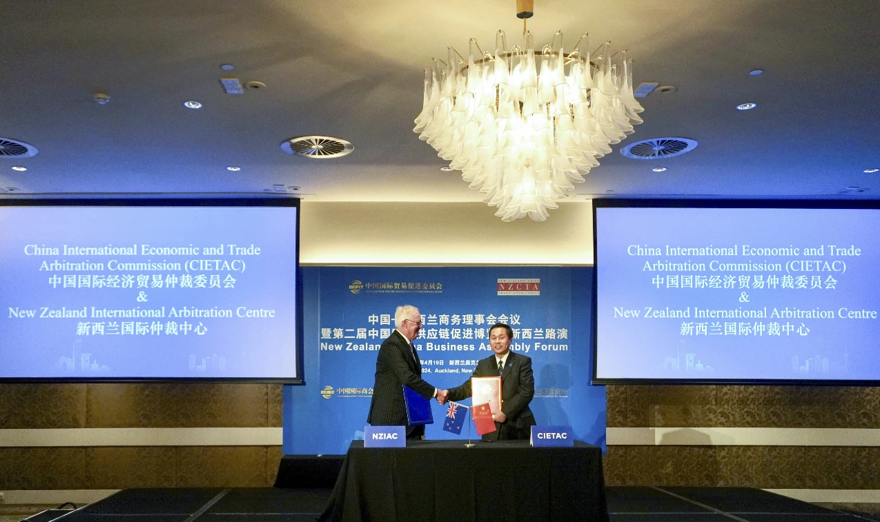 4月19日,在中國(guó)貿(mào)促會(huì)會(huì)長(zhǎng)任鴻斌率中國(guó)企業(yè)家代表團(tuán)訪問(wèn)新西蘭期間,中國(guó)國(guó)際經(jīng)濟(jì)貿(mào)易仲裁委員會(huì)副主任兼秘書(shū)長(zhǎng)王承杰與新西蘭國(guó)際仲裁中心主任約翰·格林在奧克蘭于第五屆中國(guó)—新西蘭商務(wù)理事會(huì)會(huì)議上簽署合作協(xié)議。中國(guó)貿(mào)促會(huì)會(huì)長(zhǎng)任鴻斌、新西蘭中國(guó)貿(mào)易協(xié)會(huì)主席約翰·考克倫、中國(guó)駐新西蘭大使王小龍等出席簽約儀式。