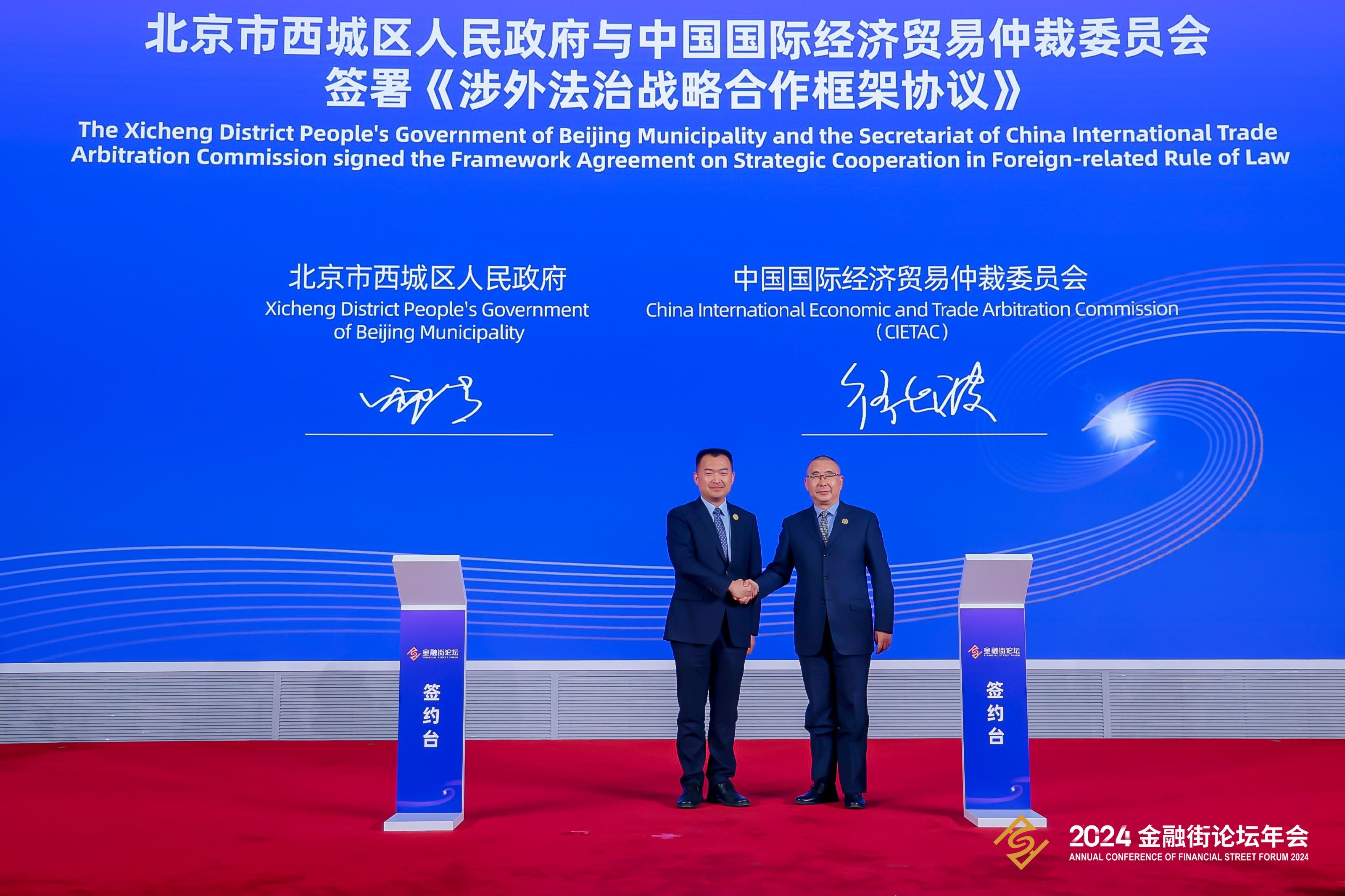 近日,在北京金融街服務(wù)局和中國經(jīng)濟信息社聯(lián)合承辦的2024金融街論壇年會金融街之聲——“金融街發(fā)布”成果專場發(fā)布活動上,中國國際經(jīng)濟貿(mào)易仲裁委員會(以下簡稱“貿(mào)仲”)與北京市西城區(qū)人民政府簽署《涉外法治戰(zhàn)略合作框架協(xié)議》。貿(mào)仲黨委書記、副秘書長徐延波與北京市西城區(qū)副區(qū)長邴浩共同在《涉外法治戰(zhàn)略合作框架協(xié)議》上簽字。