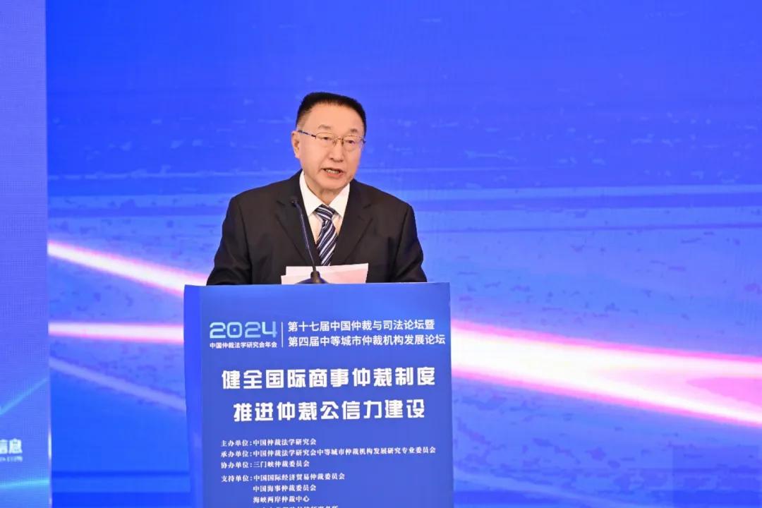 (中國國際貿(mào)易促進委員會黨組成員、副會長、中國仲裁法學研究會會長于健龍作開幕致辭)