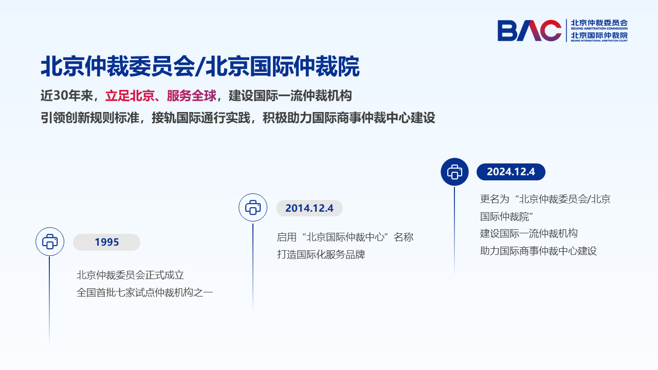 為積極響應(yīng)中央關(guān)于在北京市打造“服務(wù)國際科技創(chuàng)新中心與國際交往中心建設(shè)的國際商事仲裁中心”的要求,支持國際商事仲裁中心建設(shè),經(jīng)北京市司法局依法變更登記,北仲于2024年12月4日將“北京仲裁委員會/北京國際仲裁中心”的名稱變更為“北京仲裁委員會/北京國際仲裁院”。