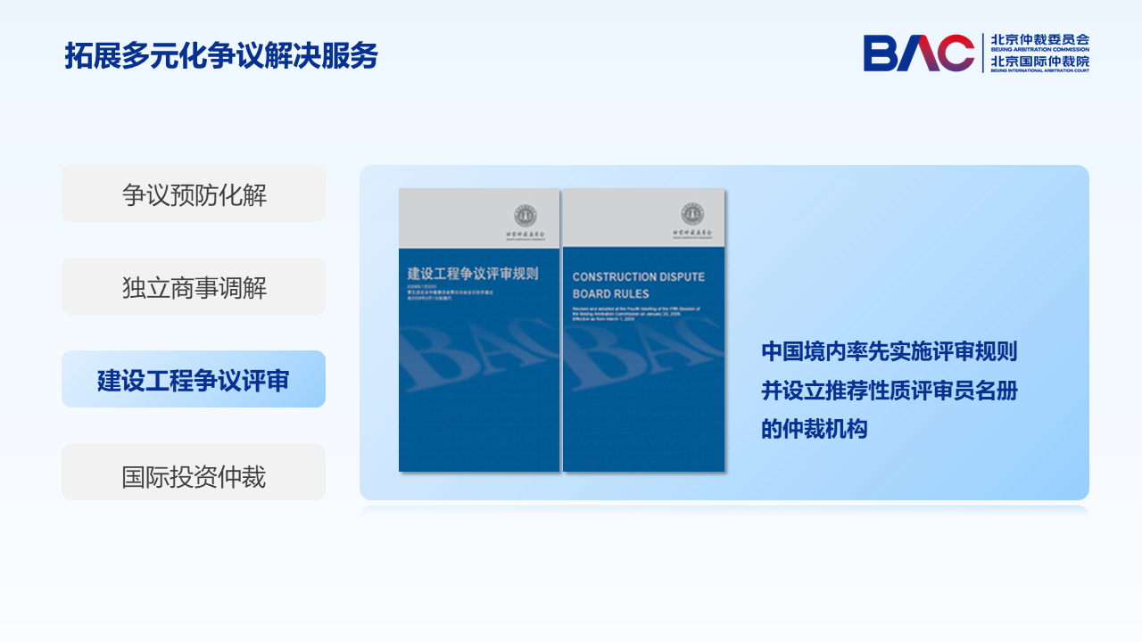 北仲在2009年即頒布了《建設(shè)工程爭議評審規(guī)則》,是中國境內(nèi)率先實(shí)施評審規(guī)則并設(shè)立推薦性質(zhì)評審員名冊的仲裁機(jī)構(gòu)。這一規(guī)則在實(shí)踐中多次被當(dāng)事人選擇適用,并成功助力當(dāng)事人快速解紛。同時(shí),這一規(guī)則也為聯(lián)合國貿(mào)法會第二工作組于2022年啟動(dòng)的審裁規(guī)則的制定提供了中國經(jīng)驗(yàn)。