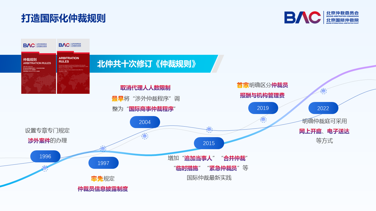 成立至今,北仲共計(jì)十次修訂《仲裁規(guī)則》。歷次修訂均緊跟國際仲裁先進(jìn)實(shí)踐,廣受國內(nèi)外關(guān)注,已成為仲裁規(guī)則修訂完善的行業(yè)引領(lǐng)者。