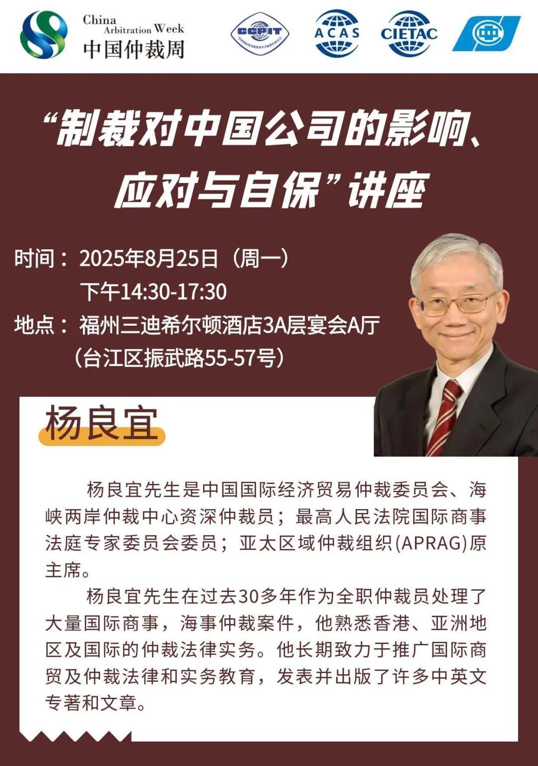 由中國國際經濟貿易仲裁委員會等單位聯合發(fā)起的2025年第十三屆中國仲裁周即將拉開帷幕。為進一步提升中國仲裁周活動平臺專業(yè)價值與全球影響力,福建省貿促會、海峽兩岸仲裁中心、福建省外商投資企業(yè)協(xié)會和貿仲福建分會將于2025年8月25日舉辦“制裁對中國公司的影響、應對與自?!敝v座,期待各位嘉賓報名參與。