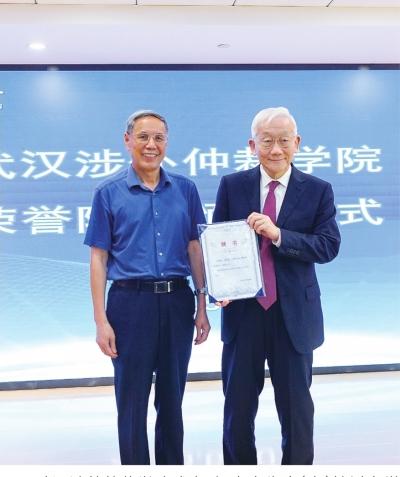 武漢涉外仲裁學(xué)院成立,楊良宜先生(右)接過名譽院長聘書。