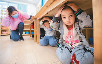 圖四:江蘇省南京市雨花臺區(qū)龍福幼兒園小朋友們學(xué)習(xí)防災(zāi)減災(zāi)自救技能。