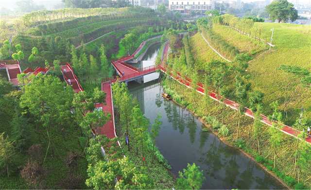 2021年,九龍坡區(qū)再度啟動(dòng)跳磴河(9條支流)“清水綠岸”治理提升工程,整治完善9條支流及城鄉(xiāng)接合部排水管網(wǎng),對(duì)薄弱段河道進(jìn)行生態(tài)修復(fù),啟動(dòng)海綿公園及廣場(chǎng)建設(shè),建設(shè)面源污染控制設(shè)施。同步啟動(dòng)流域內(nèi)支流生態(tài)護(hù)岸建設(shè)、中梁山及各周邊公園地塊至跳磴河健身步道串聯(lián)更新等,全域水環(huán)境和人居環(huán)境質(zhì)量不斷提升。