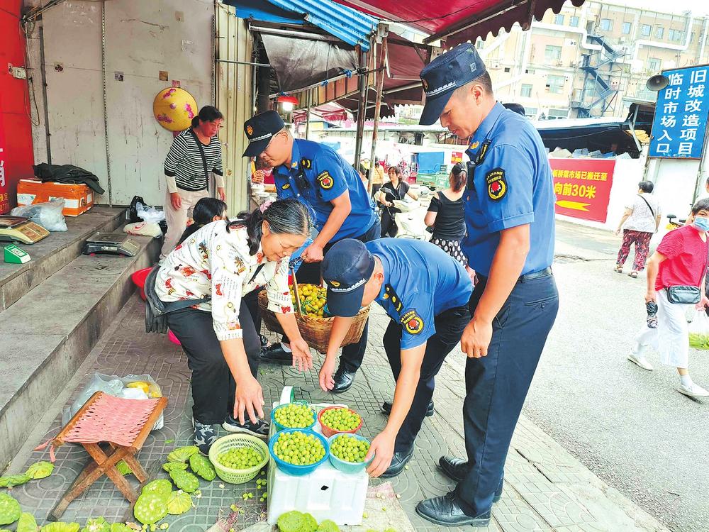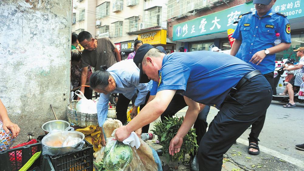 “我們采取延時、錯時,定人、定崗、定責(zé)的工作機(jī)制,安排執(zhí)法隊員錯時對農(nóng)貿(mào)市場周邊及臨街門店開展逐一檢查,堅決杜絕部分商戶、流動攤販出店經(jīng)營、占道經(jīng)營和擺放遮陽傘阻擋過道等行為?!痹诮瘗樎繁眰?cè)花板橋菜市場及花鳥路周邊,區(qū)城管局五里牌中隊通過采用錯時執(zhí)法和取締一批、歸市一批、疏導(dǎo)一批的辦法,在花鳥路附近的南北樓設(shè)立臨時疏導(dǎo)區(qū),為自產(chǎn)自銷的菜農(nóng)創(chuàng)造合法的經(jīng)營地點,通過耐心宣傳相關(guān)政策規(guī)定,主動幫助商戶搬移占道物品等文明執(zhí)法方式,工作得到廣大商戶和流動攤販的理解及市場周邊百姓的支持。