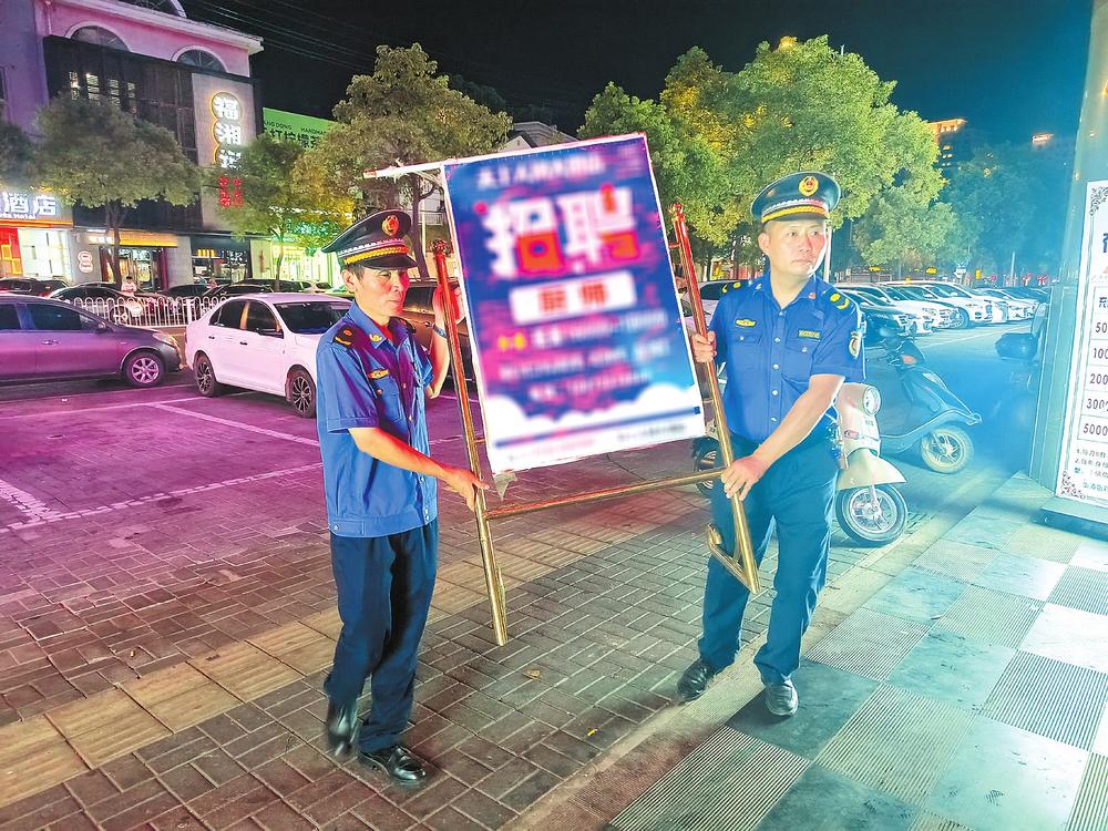 夏季是夜宵燒烤攤點店外經(jīng)營、流動瓜果散販增多的高峰季節(jié),使得夜間城市管理難度加大?!袄习?,廣告牌不能占道擺放,我們幫您搬進(jìn)店內(nèi)!”8月25日晚8點,夜幕來臨,在磨子山南路,路燈照亮了岳陽樓區(qū)城管委城管三大隊執(zhí)法隊員忙碌的身影,他們正在對夜間人流量較大、群眾反復(fù)投訴的重點難點路段和區(qū)域進(jìn)行巡查管控,嚴(yán)防夜市出店經(jīng)營、露天燒烤、油煙污染及夜間施工場地?fù)P塵污染、違規(guī)渣土車無證運輸?shù)葐栴}發(fā)生。