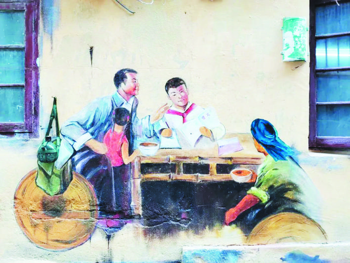 居民墻涂上上世紀(jì)80年代“民俗”主題墻繪,生火做飯的爺爺奶奶、買冰棍的小孩、看書的學(xué)生、帶著錄音機(jī)騎車飛奔的青年……這些栩栩如生的繪畫和屋檐下掛著的玉米、紅辣椒、大蒜、鳥籠等,給吳山巷增添了生氣和樂趣。路過(guò)的行人看到這些記錄著過(guò)往歲月經(jīng)歷的墻繪,不免回想起過(guò)去,感嘆現(xiàn)在生活的美好。