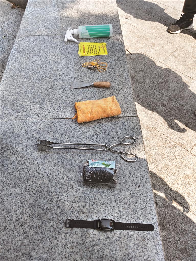 “非機(jī)動車停車區(qū)的車輛亂停,請來整理?!薄皬V場上有一塊油污,趕緊把洗掃機(jī)開過來清理?!薄肮徽九_上的座椅上有灰塵,來擦拭下?!薄浾攥F(xiàn)場看到,新吳“城市管家”除了統(tǒng)一著裝和隨身攜帶一部對講機(jī)外,還統(tǒng)一配備了智能手環(huán)、噴水壺、鏟子、夾子、干濕抹布、口哨、文明停車告知單等作業(yè)“八件套”(如圖)。江溪街道“城市管家”郭師傅邊展示他的裝備邊介紹:“這些都是我們?nèi)粘9ぷ髦械挠H密‘伙伴’,能讓我的工作更高效。比如智能手環(huán),不僅能記錄我日常的工作軌跡,還能監(jiān)測心率、血壓、血氧等身體數(shù)據(jù)。如果在工作中出現(xiàn)身體不適,手環(huán)會及時提醒我休息。鏟子、噴水壺、抹布等工具小巧便捷,分類放到定制的腰包里,隨身攜帶,拿取方便?!?/p>