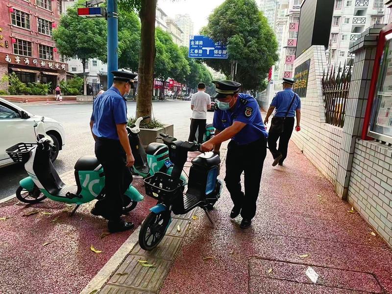 執(zhí)法人員整治未按規(guī)定停放的共享電單車(青秀區(qū)城市管理綜合行政執(zhí)法隊供圖)