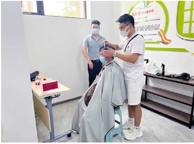 外賣小哥在清馨苑社區(qū)的新就業(yè)群體服務(wù)驛站免費(fèi)理發(fā)