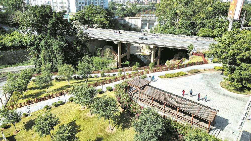 步道干凈整潔、河溝清水流淌、鳥鳴聲清脆悅耳……每天一大早,居住在城區(qū)維林市場的居民羅壽豐都會帶孫子到草鞋溝生態(tài)公園散步。這里樹木成蔭,綠草遍地,大小不一的鵝卵石錯落鋪設在步道一側,醒目的紅漆圍欄點綴著河溝兩岸的綠茵植被,一片秋意盎然。