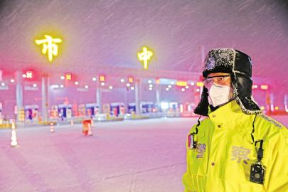 風雪夜里交警扼守泉城南大門。(呂傳泉攝)