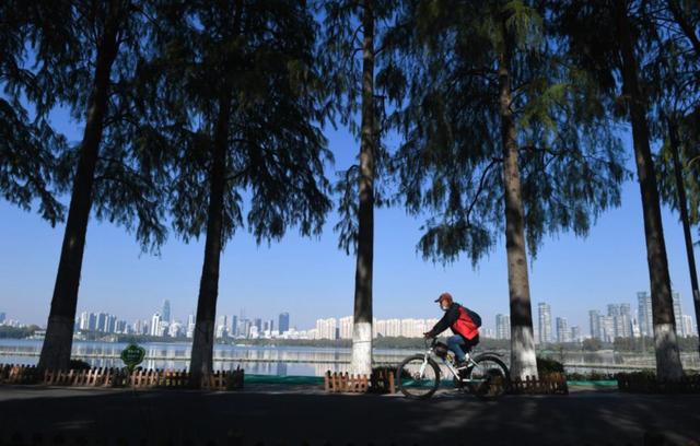 市民在武漢東湖綠道騎行休閑。新華社記者 程敏 攝