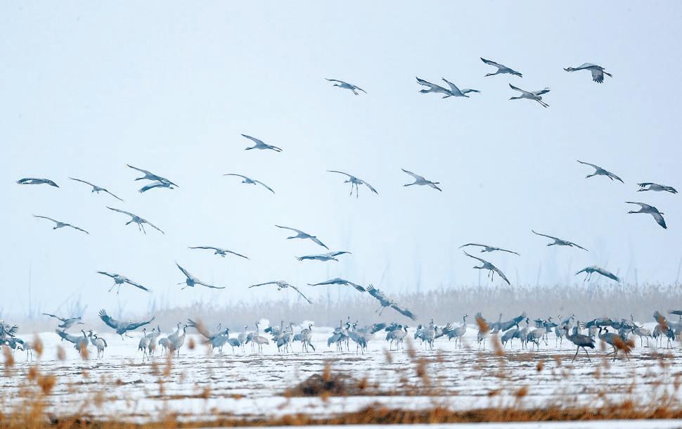 除了天鵝等游禽,雁鴨類的種群數(shù)量也明顯上升。去年冬天,總共有450只灰鶴在官?gòu)d水庫(kù)越冬,如今,南來(lái)的灰鶴與越冬灰鶴合群,數(shù)量上升到了600多只。此外,隊(duì)員們還監(jiān)測(cè)到了遠(yuǎn)道而來(lái)的白枕鶴、鴻雁、豆雁、赤麻鴨、羅紋鴨等。