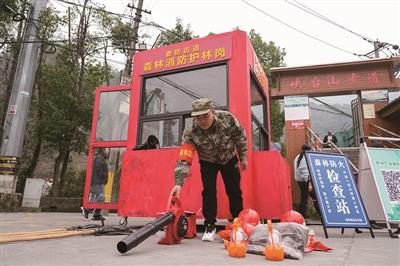 在東耕村吹臺(tái)山索道,記者看到了一個(gè)紅色的核酸小屋。湊近看,小屋里擺放著滅火器、阻燃服、2號(hào)打火棒等等滅火設(shè)備。