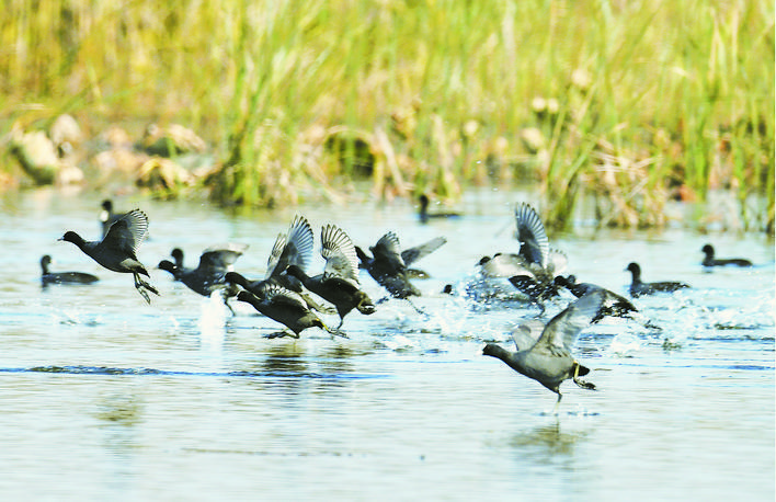 成群的“白骨頂”在巢湖半島國(guó)家濕地公園覓食。記者 張大崗 攝