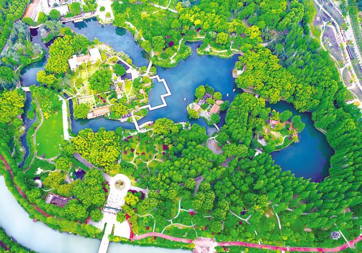 5月7日,鳥瞰武漢市青山公園,綠樹成蔭,生機勃勃。近年來,武漢市青山區(qū)加大生態(tài)文明建設,昔日“灰城”展露青翠面容,近五年建成11座公園,人均公園綠地面積位居武漢前列。(記者 朱熙勇 攝)