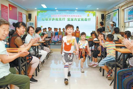 在北京市順義區(qū)勝利街道龍府花園社區(qū)新時(shí)代文明實(shí)踐站內(nèi),一場(chǎng)社區(qū)居民和小朋友共同參與的“垃圾分類我先行 變廢為寶我最行”活動(dòng)日前舉行。孩子們?cè)谏鐓^(qū)志愿者的幫助下,利用可回收物制作環(huán)保服裝并T臺(tái)秀,創(chuàng)作環(huán)保主題手工、繪畫(huà),在趣味活動(dòng)中提升居民環(huán)保理念,普及生活垃圾分類知識(shí)。記者 武亦彬 攝