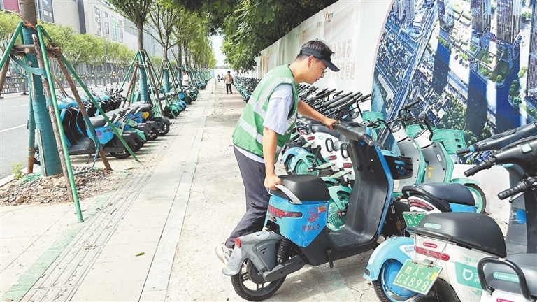 7月20日,南昌市紅谷灘區(qū)萬象路上,早高峰剛過不久,一名穿著綠色馬甲的共享電單車運維人員便忙活開了。與以往不同的是,在他整理的車輛中,不僅有綠色的“自家”車輛,還有藍(lán)色、黃色的“別家”車輛。一個小時后,100多輛品牌各異的共享電單車便整整齊齊地停放好了。