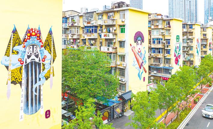 10月8日,改造后的武漢市江漢區(qū)北湖環(huán)保社區(qū)外墻上的京劇彩繪,展示生旦凈末丑人物臉譜。2023年,武漢將老舊小區(qū)改造與城市更新單元相結(jié)合,聚焦“一老一小”重點人群,啟動8個成片改造示范點項目,不斷提高小區(qū)居民生活品質(zhì)。截至目前,今年全市已完成269個老舊小區(qū)改造。(記者 薛婷 攝)