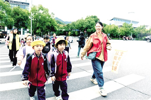 吉首市交警女子護(hù)學(xué)崗隊(duì)員護(hù)送學(xué)生過(guò)馬路。 楊賢清 攝