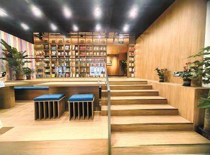 一樓的核心區(qū)域被命名為“紫竹客廳”,一眼望去,擺放著各類組合式桌椅,有居民三三兩兩地坐下閑聊。整排窗的位置被設(shè)計(jì)成長(zhǎng)條吧臺(tái),可供年輕人獨(dú)坐休閑。而大屏幕底下的方塊格子其實(shí)“藏”著一個(gè)個(gè)小方凳,可隨時(shí)拿出來使用。