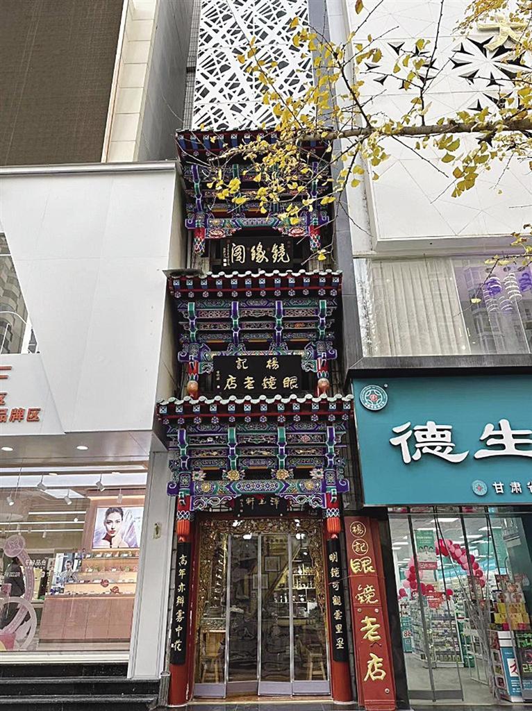 榫卯鑲嵌、手工木雕、精致彩繪、金箔貼邊,在張掖路步行街上,楊記眼鏡行的門樓招牌格外亮眼,雖然只有三四米寬的窄小門面,但店外從上而下的三塊古韻招牌彰顯出這家店的“不簡單”?!白钕旅孢@塊‘澤玉軒’的招牌是我家祖輩楊澤玉開創(chuàng)這家眼鏡行時留下的字號”,楊記眼鏡行是蘭州一家老字號的石頭眼鏡售賣和維修小店,光是制作修理石頭眼鏡這項手藝就已經(jīng)傳到了第五代,其店鋪在二十世紀八九十年代就獲得過商務部的“中華老字號”認可。