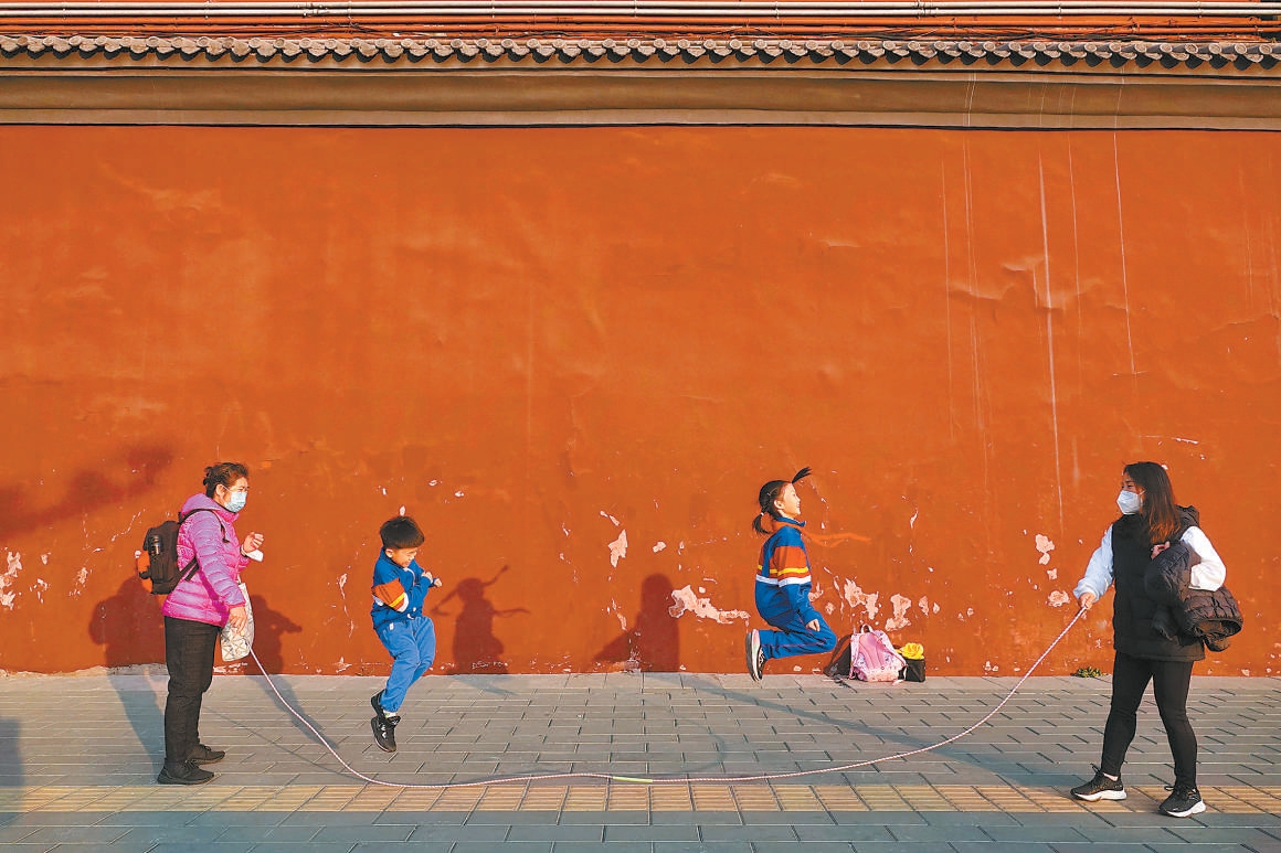 雍和宮古老的紅墻下,剛剛放學的孩子們在冬日暖陽下快樂地跳繩。 楊建國攝
