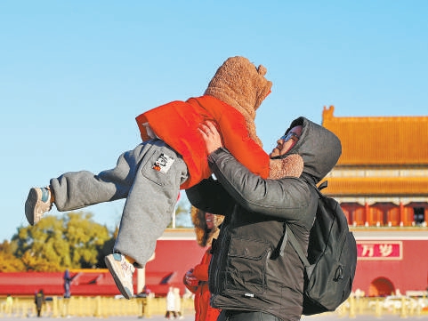 父子倆不懼寒冷,在天安門廣場上快樂嬉戲,享受幸福瞬間。 王新 攝