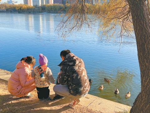 天氣晴朗,一家三口在玉淵潭公園湖邊看小鴨子嬉戲。耿衛(wèi)紅 攝