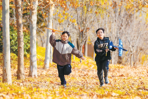 郊野山林間,兩個孩子在金黃色的落葉堆中奔跑,享受快樂童年。 金建軍 攝