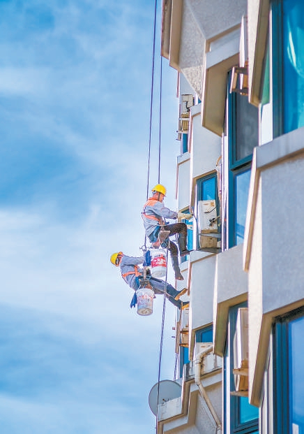 朝陽區(qū)將臺西路芳園里,工人們正在忙著為高樓“刷身洗臉”,守護美麗家園。劉玉松 攝