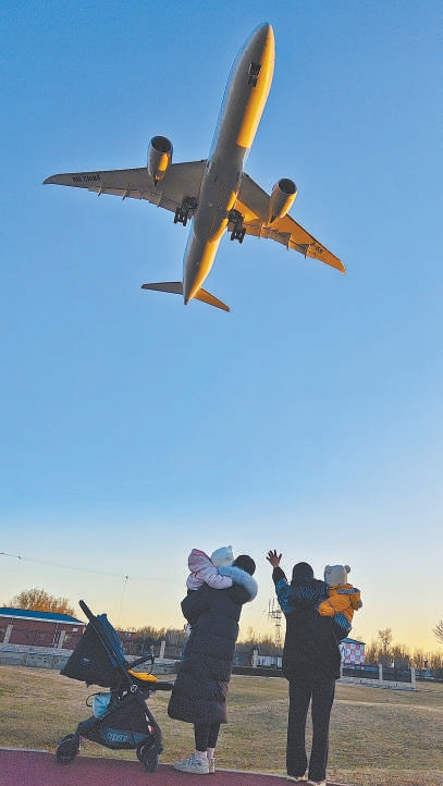 夕陽照耀著大地,給人們帶來溫暖和希望。首都機場,一家人正向著大飛機快樂招手。柳峰 攝