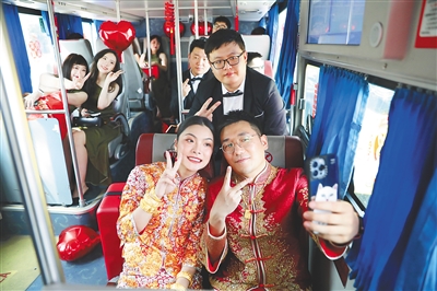 “結(jié)婚當(dāng)天,大家需要張羅的事很多,需要早起,會(huì)擔(dān)心司機(jī)疲勞駕駛,大巴車剛好就解決了這個(gè)煩惱?!比ツ?2月28日結(jié)婚的李媛媛也選擇了大巴車迎親。她說,現(xiàn)在年輕人結(jié)婚,追求婚禮簡(jiǎn)約、熱鬧,大巴車安全又環(huán)保就成為他們迎親車輛選擇的重要考慮之一??吹揭灿泻芏嘈氯诉x用大巴車迎親,她和丈夫胡先生也有了嘗試的想法。誰料想,這個(gè)提議得到雙方父母的贊同?!凹依锏挠H戚都很贊同,大家可以坐在大巴車內(nèi)互動(dòng)交流,氛圍非常好?!崩铈骆抡f,與傳統(tǒng)迎親車隊(duì)相比,租用大巴車更加經(jīng)濟(jì)實(shí)惠。