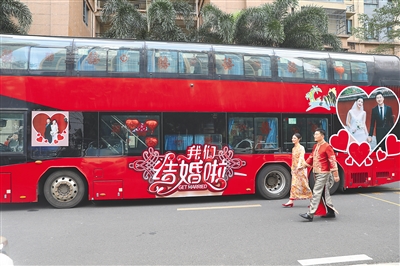 在??陉P(guān)注大巴車當(dāng)婚車的年輕人并不在少數(shù)。“每周我們都會(huì)接到咨詢電話,我們會(huì)預(yù)留專門車輛運(yùn)營婚車業(yè)務(wù),有雙層觀光巴士也有常規(guī)大巴?!焙?诮煌都瘓F(tuán)公交運(yùn)營分公司運(yùn)營部工作人員李國安介紹,大巴車作為婚車使用,符合綠色出行的環(huán)保理念。婚車的車身和內(nèi)部可以根據(jù)新人要求進(jìn)行個(gè)性化定制。婚車使用當(dāng)天,公司會(huì)安排一名駕駛員和一名管理人員全程陪同,做好相關(guān)后勤保障服務(wù)。