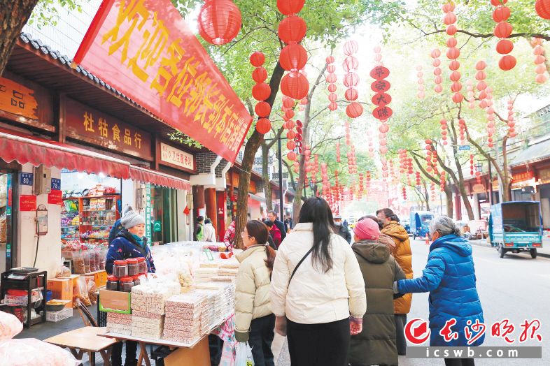 短短幾百米的年貨街上,擺滿了干果炒貨、海鮮干貨、糖果、餅干……除了這些傳統(tǒng)年貨食品外,當(dāng)然少不了承載著瀏陽(yáng)人記憶中年味的當(dāng)?shù)靥厣朗场?/p>