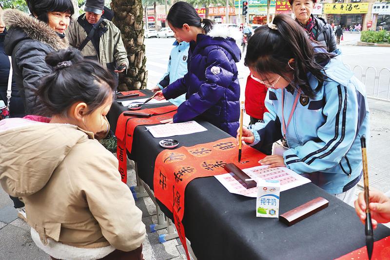 南寧市東葛路小學(xué)與東葛路社區(qū)聯(lián)合開(kāi)展黨員進(jìn)社區(qū)服務(wù)群眾志愿活動(dòng),黨員教師、學(xué)生代表紛紛執(zhí)筆,現(xiàn)場(chǎng)為社區(qū)居民書(shū)寫(xiě)春聯(lián)和“?!弊?,讓社區(qū)居民提前感受節(jié)日的溫暖。(晏維寧 攝)