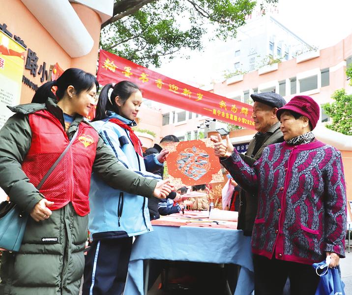 春聯(lián)寓意著人們對(duì)美好生活的向往和祝福,既是一種傳統(tǒng)文化的表達(dá),也是一種節(jié)日氛圍的營(yíng)造,讓人們?cè)谛碌囊荒昀锍錆M喜悅和希望。連日來(lái),南寧市各中小學(xué)利用寒假開(kāi)展形式多樣的活動(dòng),組織師生或走上街頭參加志愿服務(wù)活動(dòng),為社區(qū)群眾送上新春的祝福,或在家寫(xiě)春聯(lián)和“福”字,為即將來(lái)臨的新春佳節(jié)增添濃濃的喜慶氛圍。