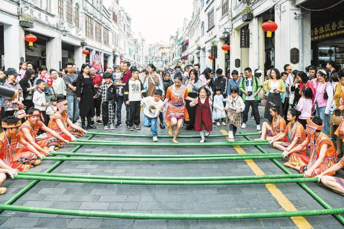 騎樓老街游人如織,傳統(tǒng)竹竿舞吸引不少市民游客參與其中,在歡快的躍動間,感受海南傳統(tǒng)民俗的魅力。記者 蘇弼坤 攝
