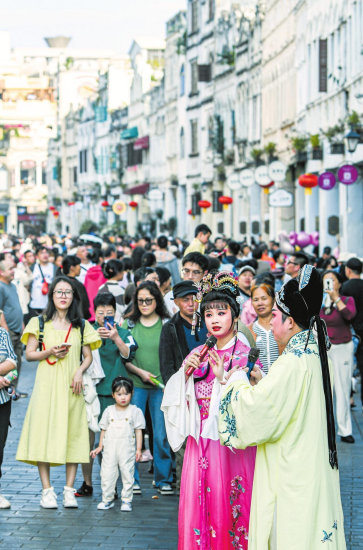 市民游客在騎樓老街豐富多彩的節(jié)慶活動中,領略??诘奈幕厣兔袼罪L情,打卡這個不容錯過的旅游地標。 記者 康登淋 攝