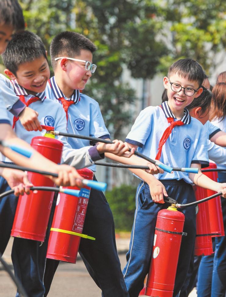 3月6日,學(xué)生們在海口市中小學(xué)生安全應(yīng)急綜合演練基地參與消防安全應(yīng)急演練。在學(xué)習(xí)使用滅火器環(huán)節(jié),孩子們認(rèn)真學(xué)習(xí),相互交流指正動(dòng)作要領(lǐng)。