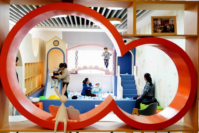 山東省菏澤市巨野縣2023年以來整合資源,按照規(guī)模適度、經(jīng)濟(jì)實(shí)用和服務(wù)高效的原則,建設(shè)15處城市社區(qū)嵌入式服務(wù)設(shè)施——黨群服務(wù)中心,面向社區(qū)居民提供養(yǎng)老托育、社區(qū)助餐、家政便民、健康服務(wù)、體育健身、文化休閑、兒童游憩等服務(wù),讓社區(qū)居民就近就便享受到優(yōu)質(zhì)普惠公共服務(wù)。圖為4月14日,在菏澤市巨野縣鳳凰社區(qū)黨群服務(wù)中心兒童游樂區(qū),家長(zhǎng)在陪護(hù)孩子游玩。(記者 郭緒雷 攝)