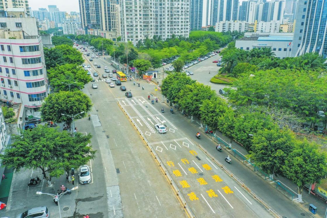 4月24日,俯瞰南沙路海南電視臺(tái)路口,新式斑馬線已更新完成。